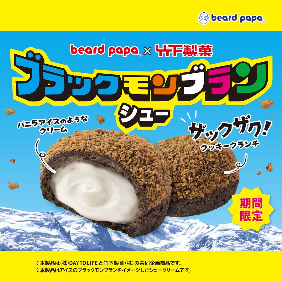 長年愛され続けている九州のソウルアイス「ブラックモンブラン」の味わいをイメージしたシュークリームです。ショコラシュー生地の表面をチョコでコーティングし、その上にザックザク食感のクッキークランチをトッピングした専用のシュー生地に、バニラアイスを思わせるふんわりとした口どけの良いクリームを詰め込みました。